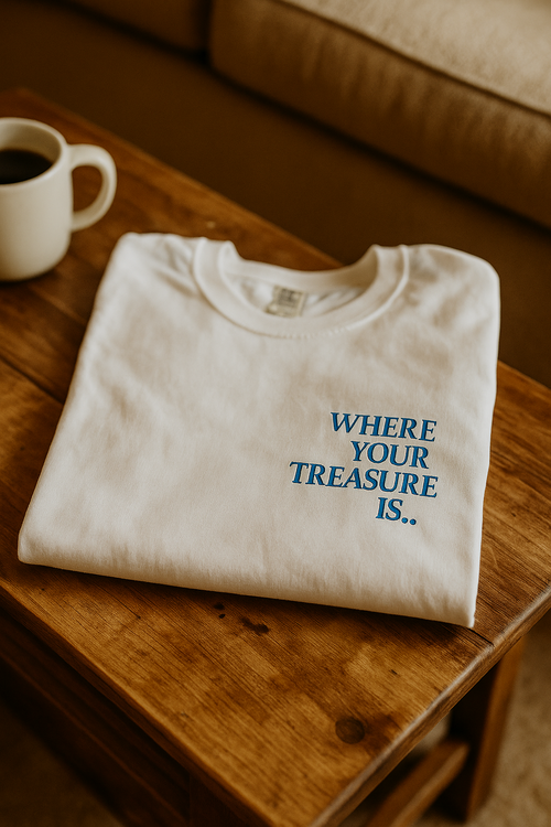 Celebrate the journey with your limited-edition “Where Your Treasure Is…” tee — available in classic white or espresso brown. The front features a subtle declaration, and the back highlights Matthew 6:21: